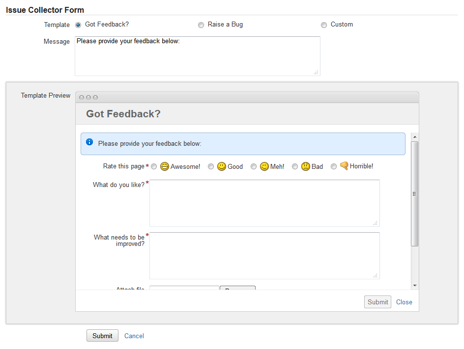 JIRA问题收集器(JIRA Issue Collector)使您可以优化您的网络应用, 给予您的用户报告错误或提供回馈的权力。您看到本页右下角的"Got Feedback?"(获得反馈吗?)按钮了吗?这就是JIRA问题收集器。按照这些步骤将它添加到您的网站中。