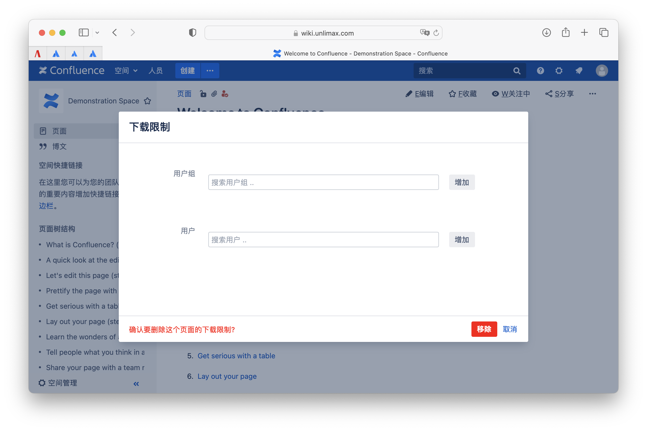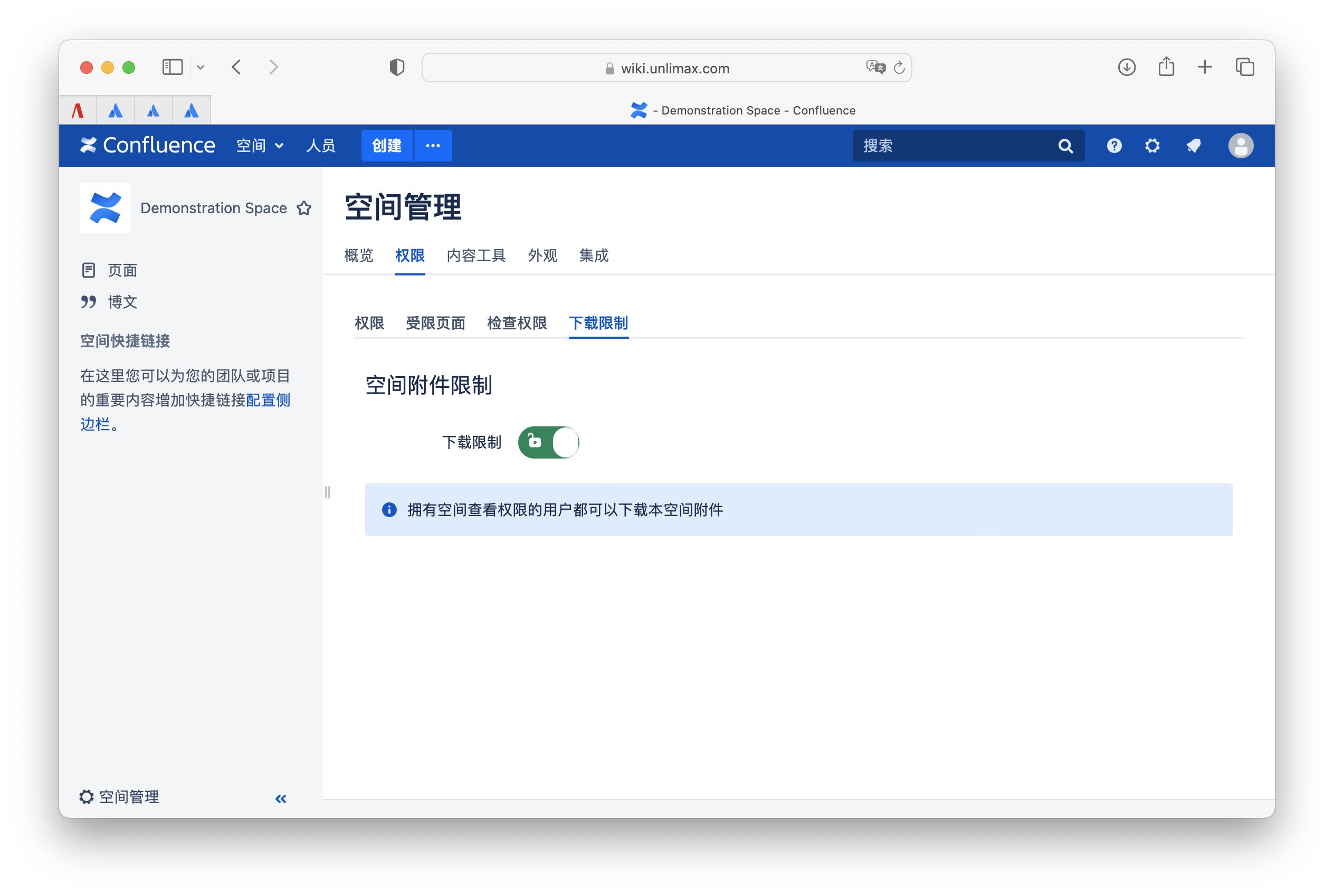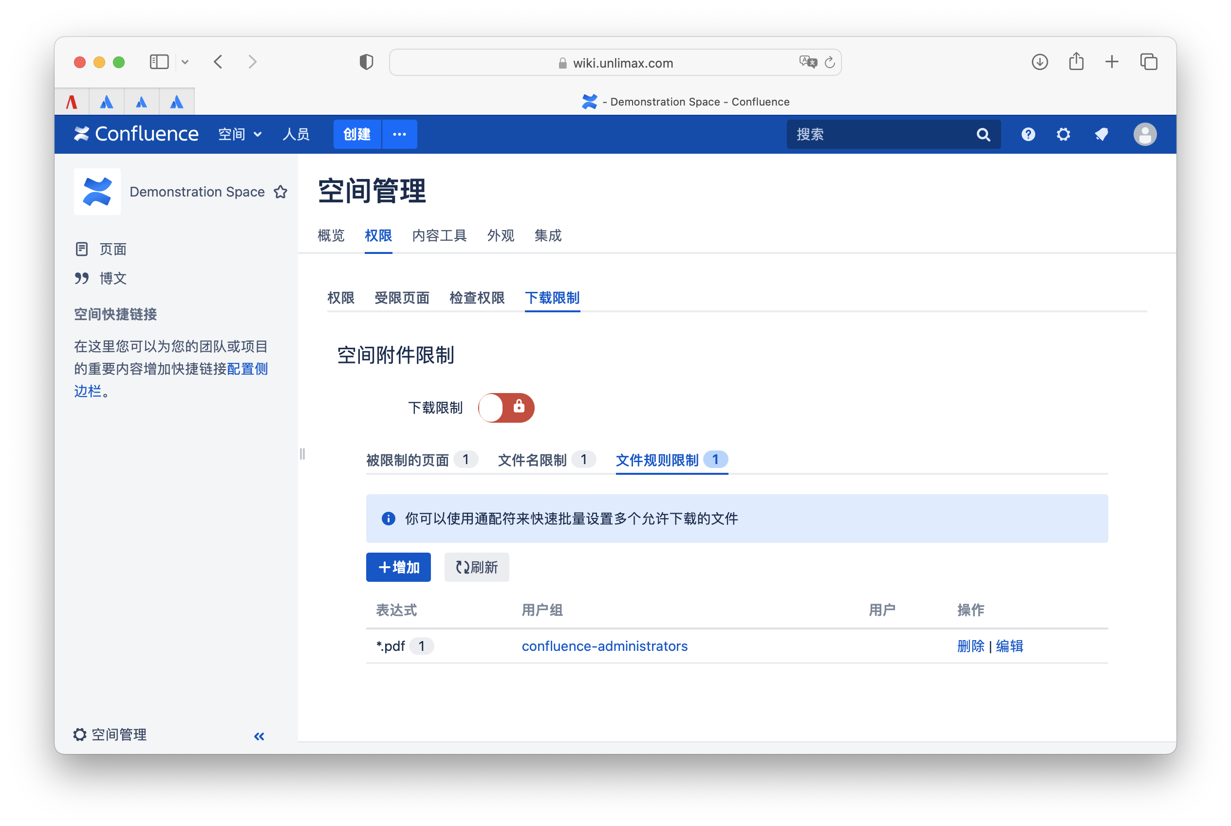 | Welcome to Confluence | 1 | 已设置下载限制 | 只允许 confluence-administrators用户组下载 | |