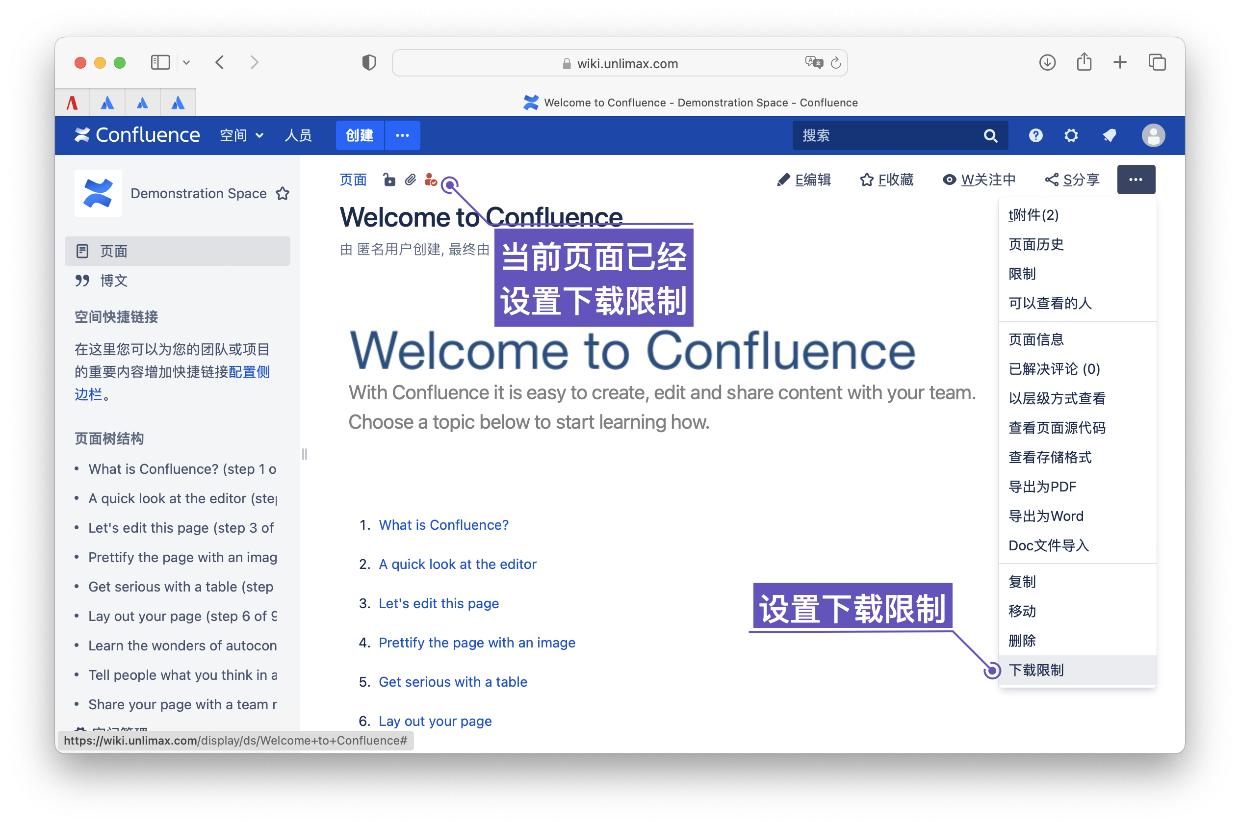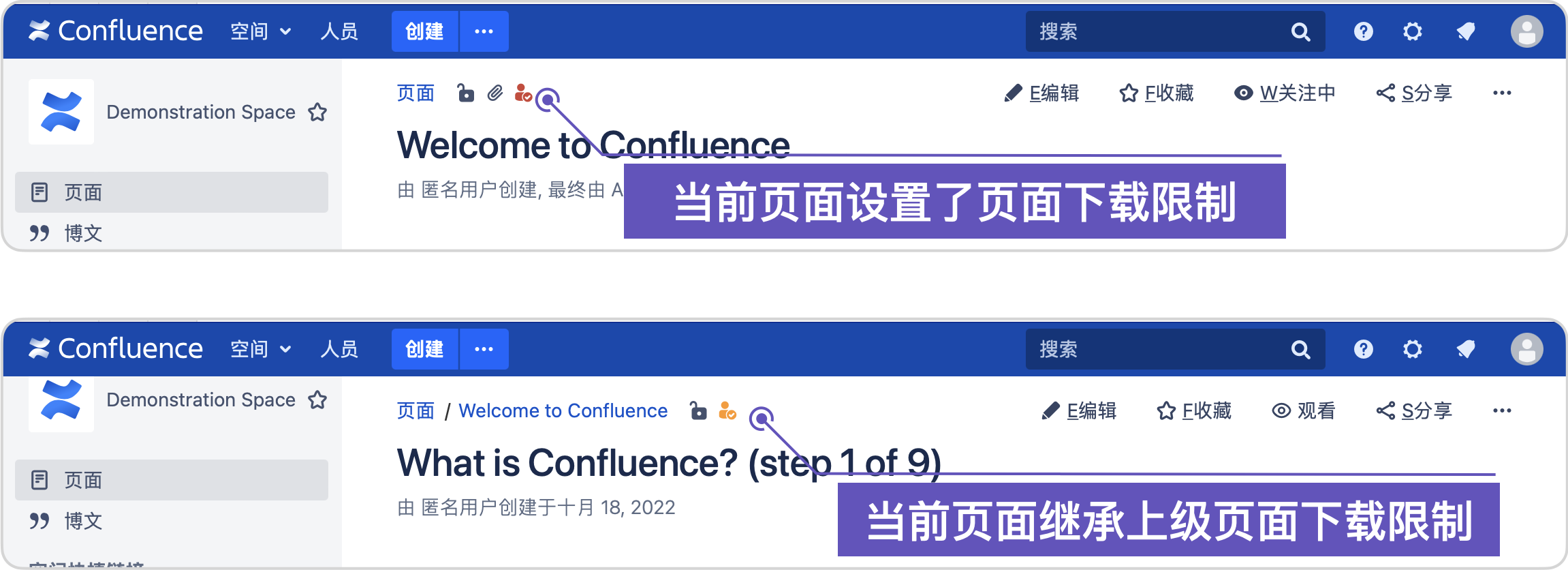 如果在页面中设置了下载限制,页面标题上方就会限制出标识,标识只有空间管理员权限才能查看到。