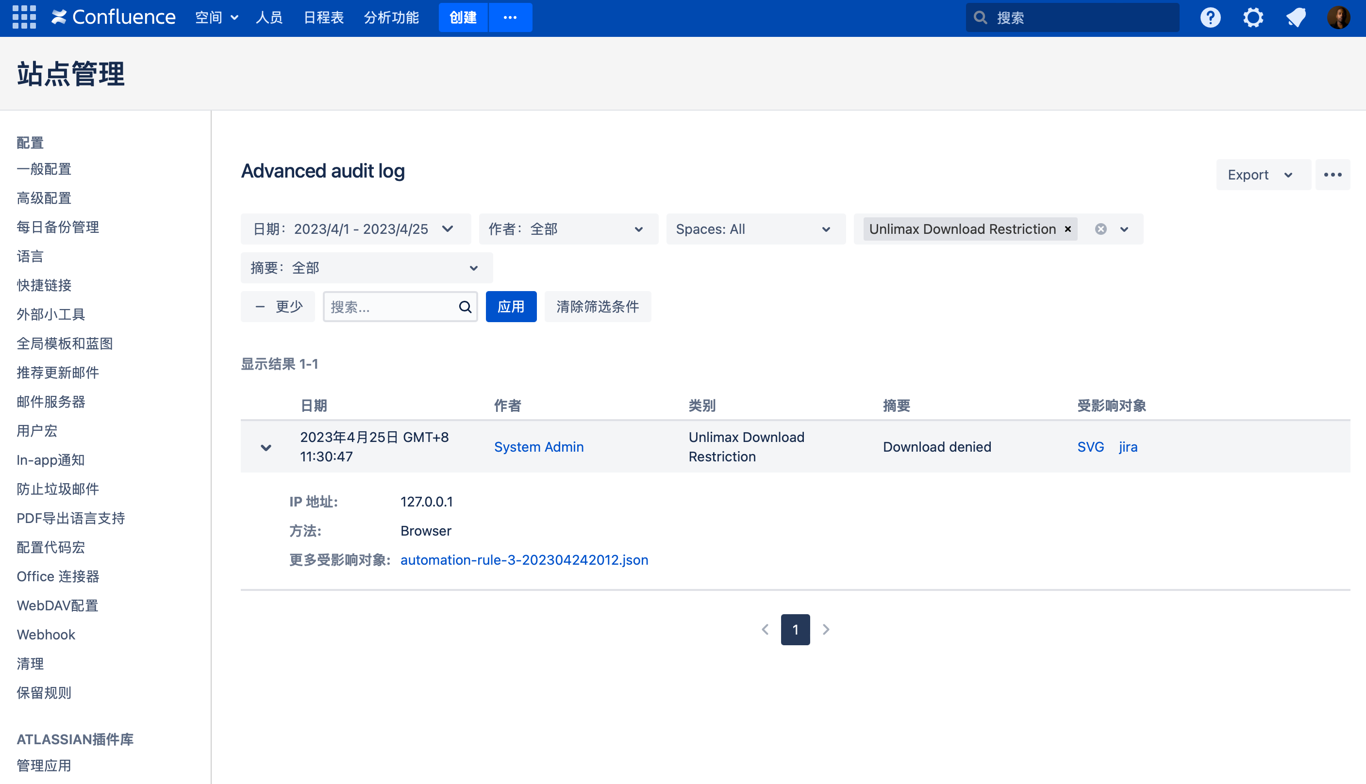 管理员可以从 Confluence 审核日志 功能中查看 被限制附件 的下载行为 (实际上这些被限制下载的文件并没有被真正下载)