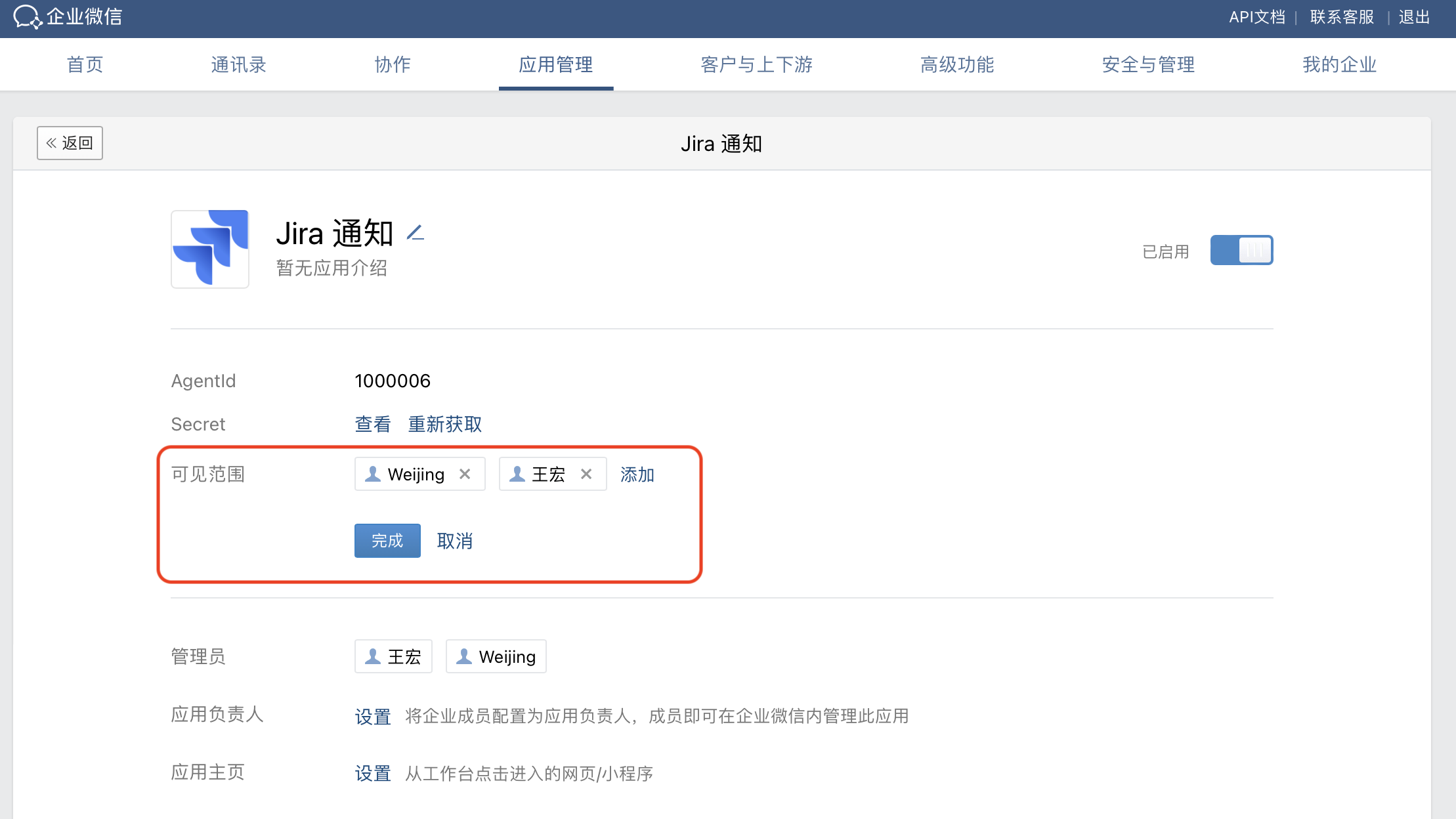 必须新建企业微信应用,以接收来自 Jira 的通知。