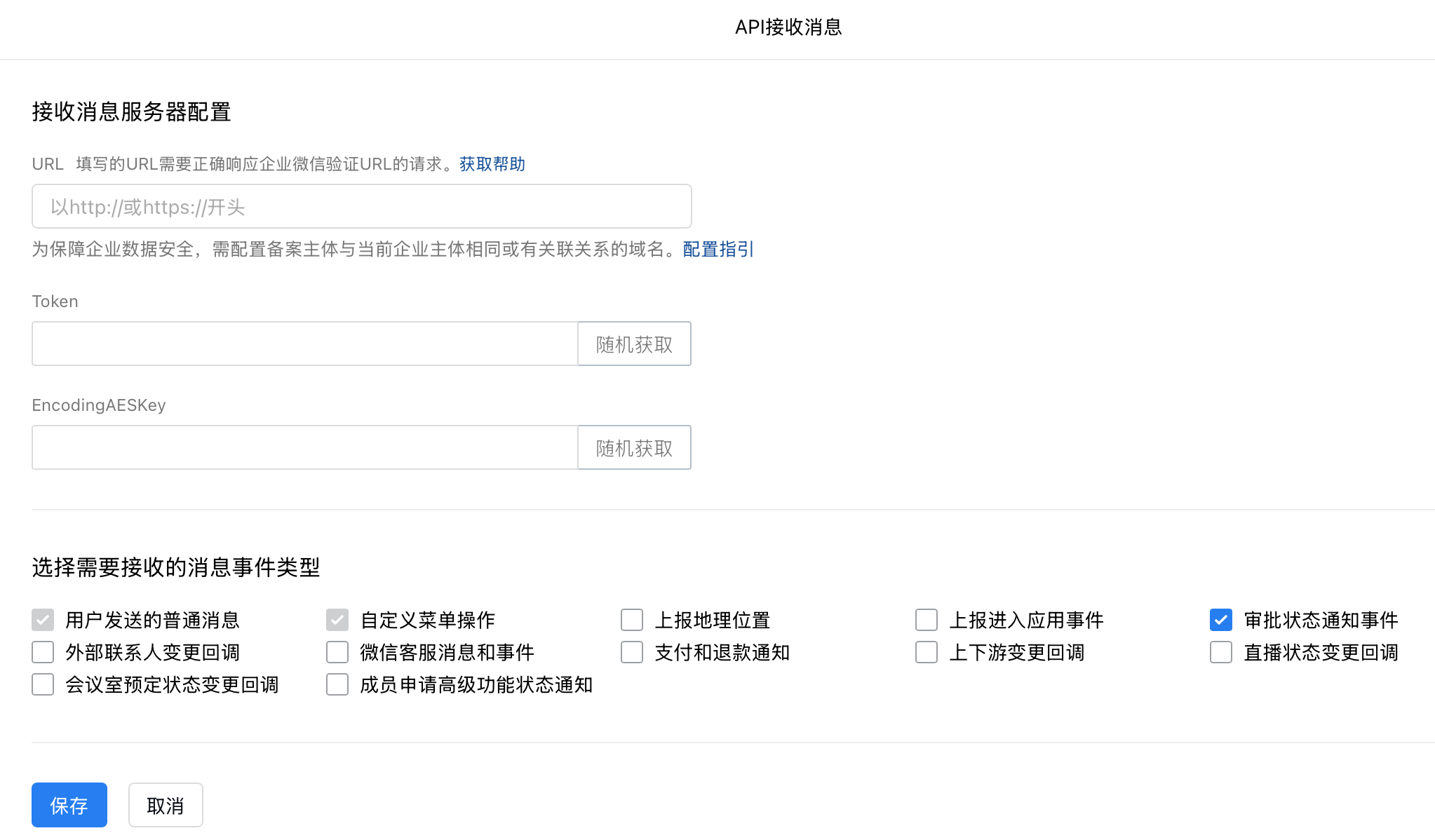 点击保存前,先将 Token 及 EncodingAESKey 的值,复制到 审批基本设置 对应的 回调令牌 及 回调密钥 中,并保存插件中的审批设置。