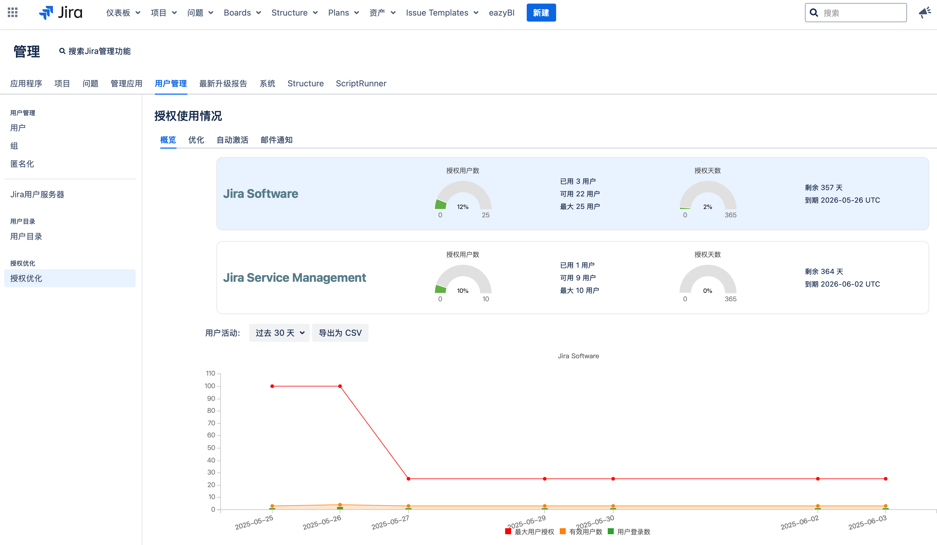 这个页面用于展示 Jira 所有应用程序的授权使用情况,包括:用户数及有效期。 你还可以查看每天用户登录的图表。