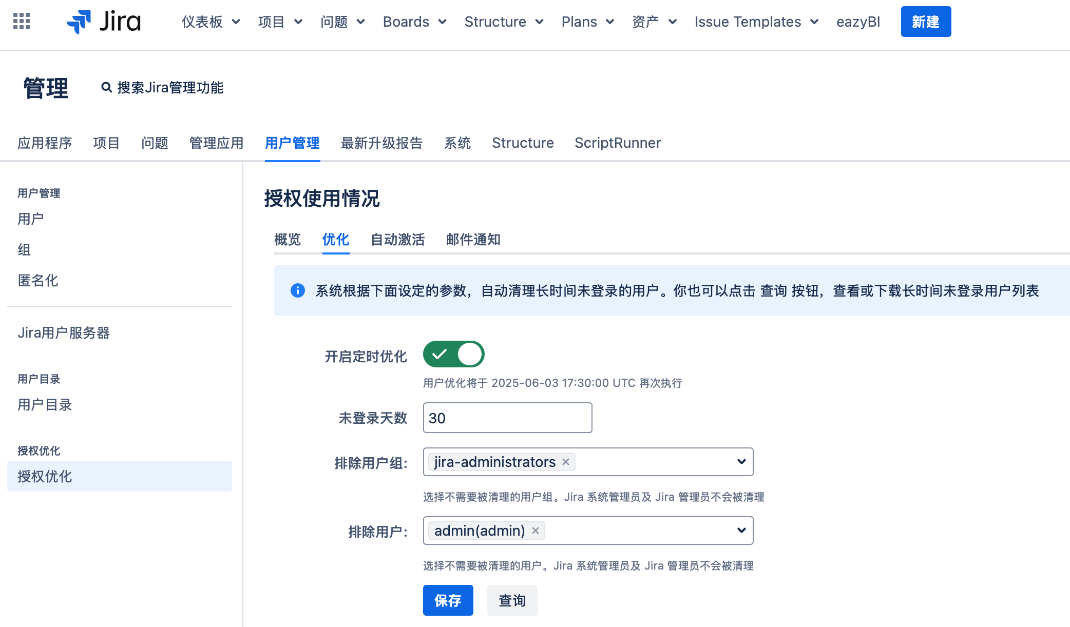 你可以设置排除用户组或排除用户,这些用户将不再优化范围内。 默认情况下,Jira 管理员不会被清理
