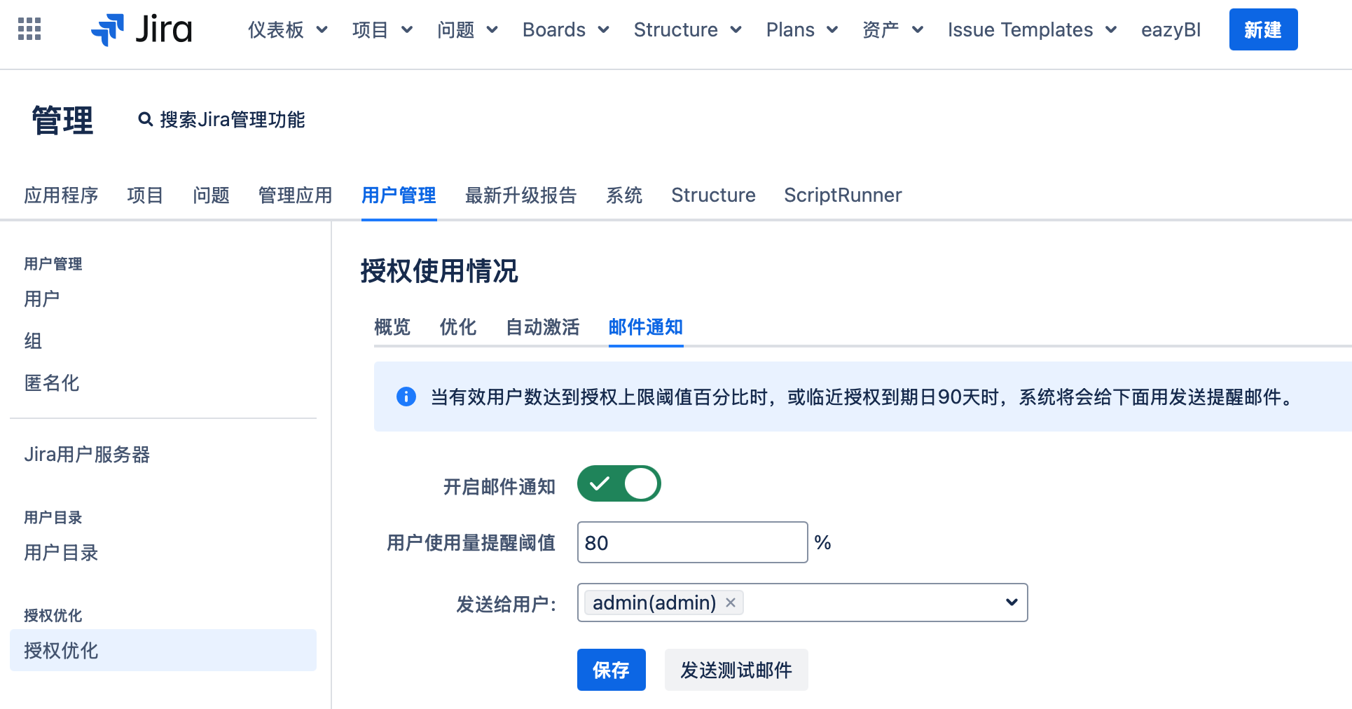 当授权用户数占用到一定比例时,或授权将在90天内到期时,系统将会发送通知邮件,提醒管理员注意。