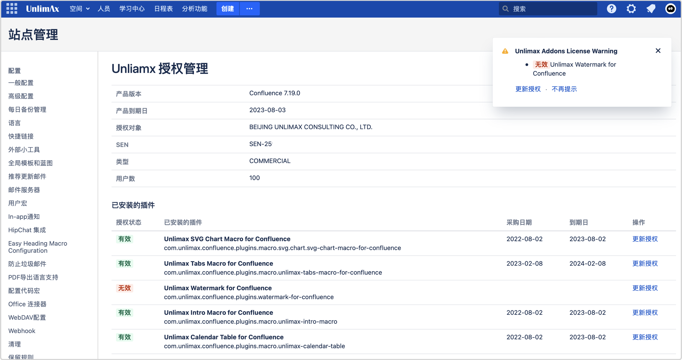3. 如果插件授权即将到期或已经过期,会在页面右上角显示提示