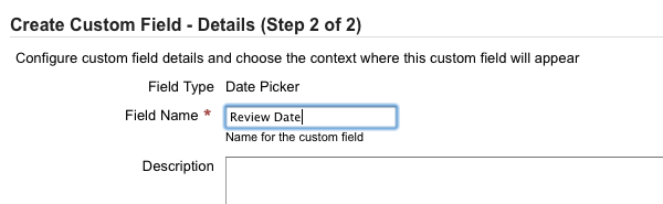 到 Administration (管理)> Issues (问题)> Fields(字段),然后创建一个新的定制字段。选择Date Picker(日期选取器)类型 :